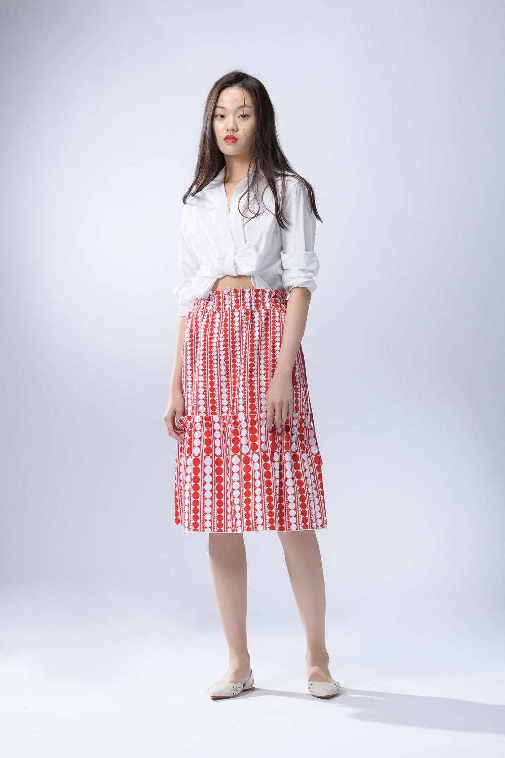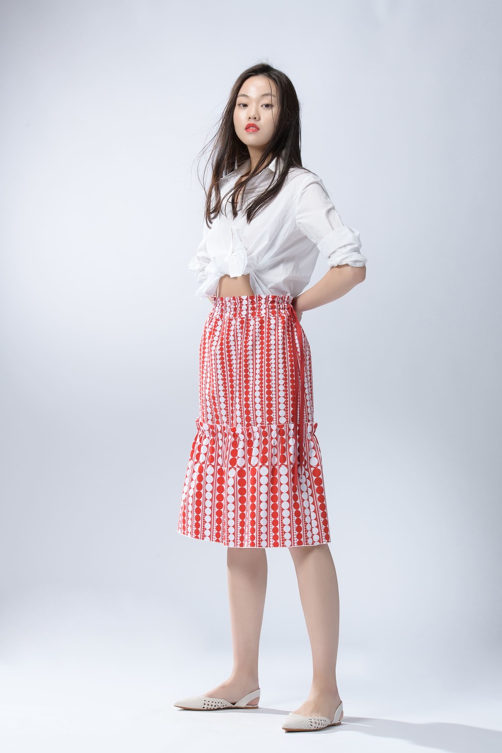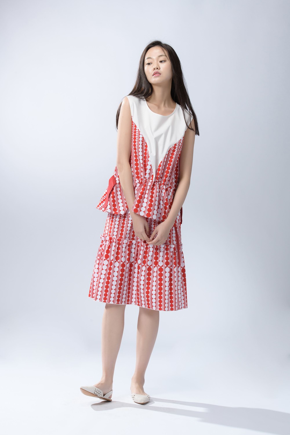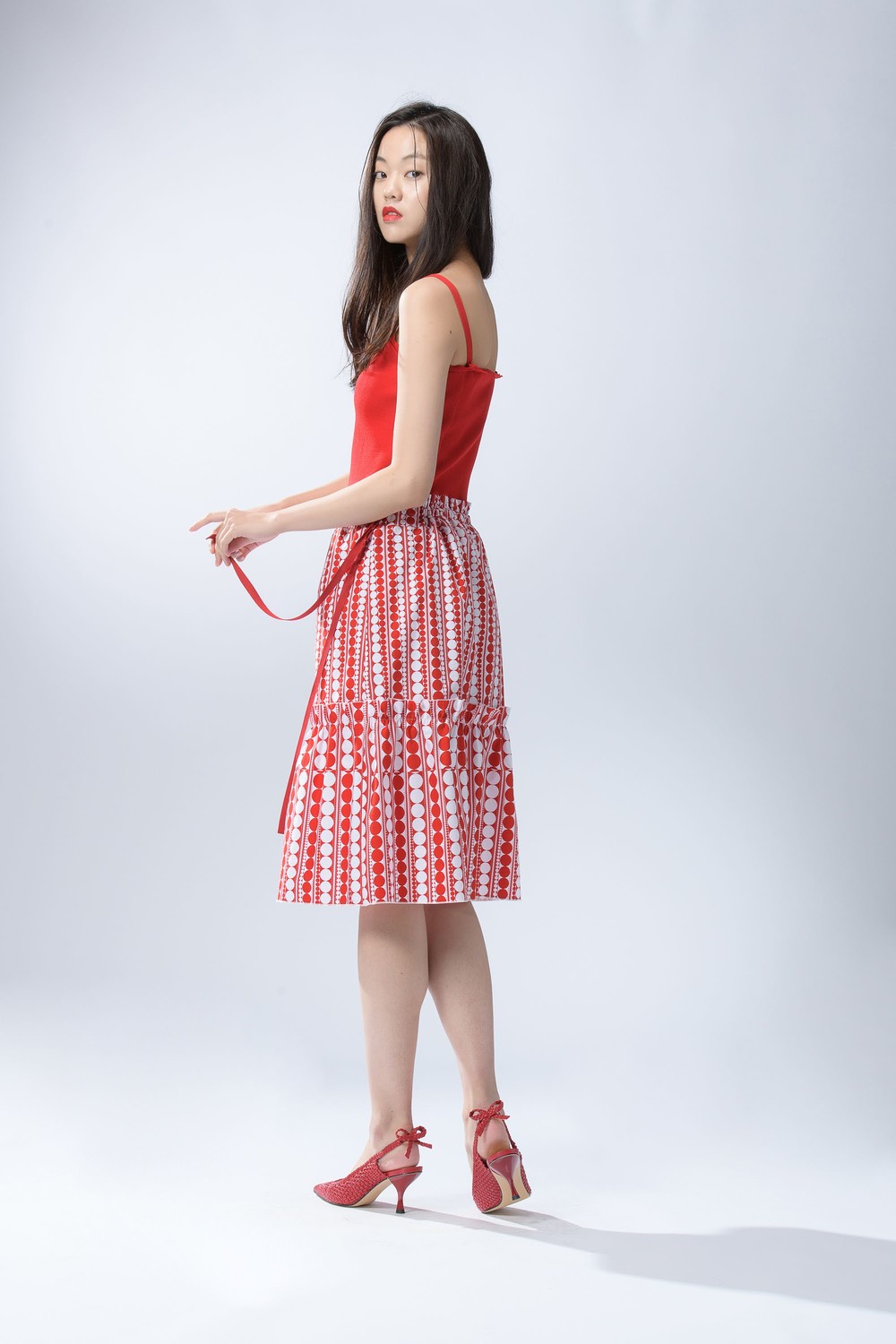 - 같은 소재의 탑과 함께 착용하여 원피스로도 연출해보세요.