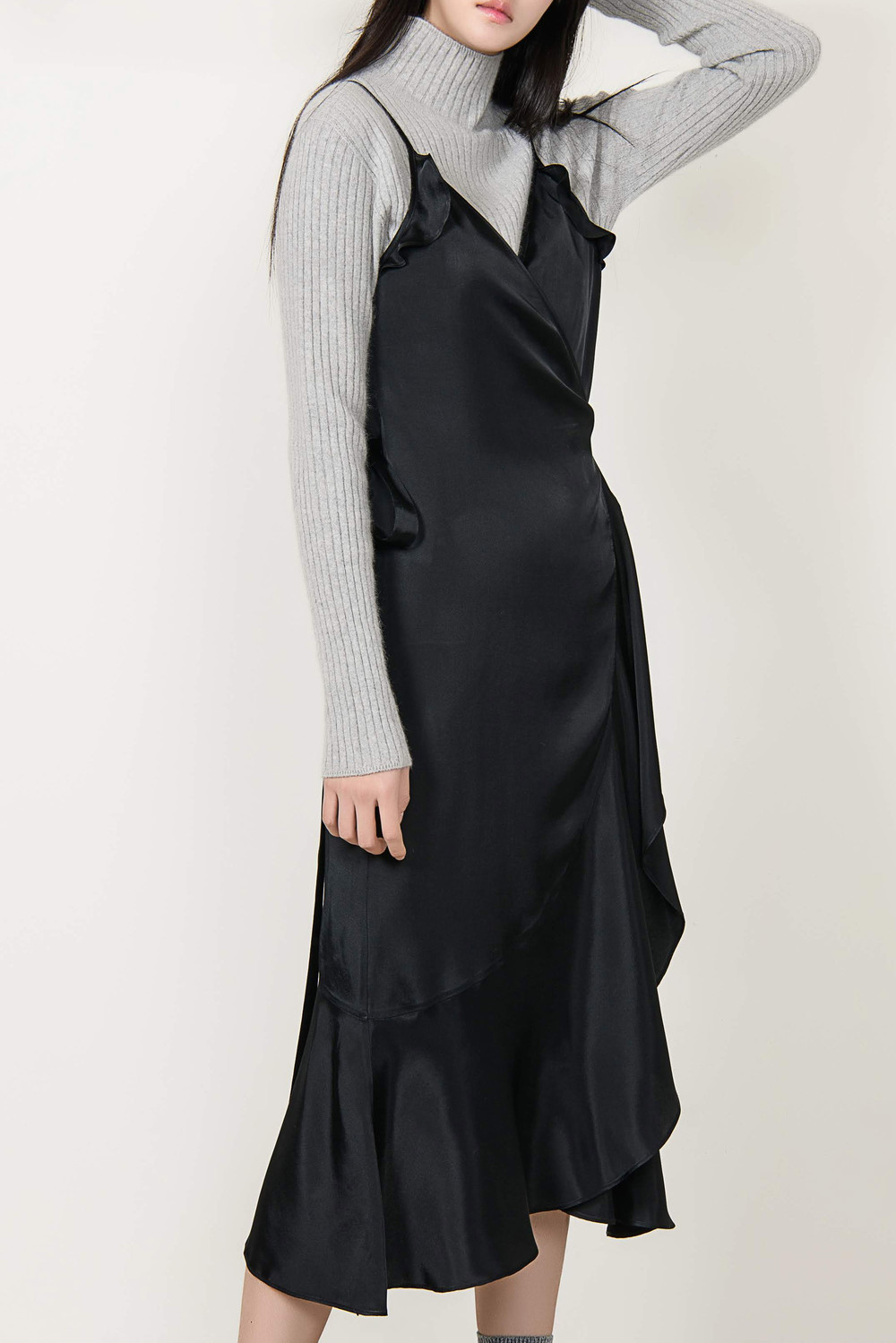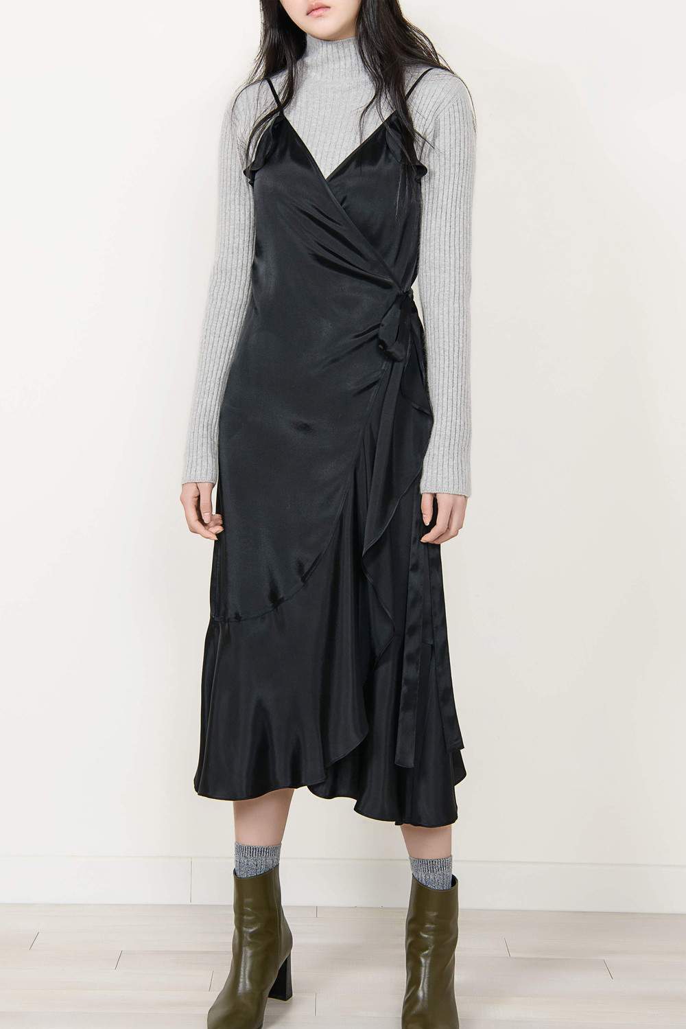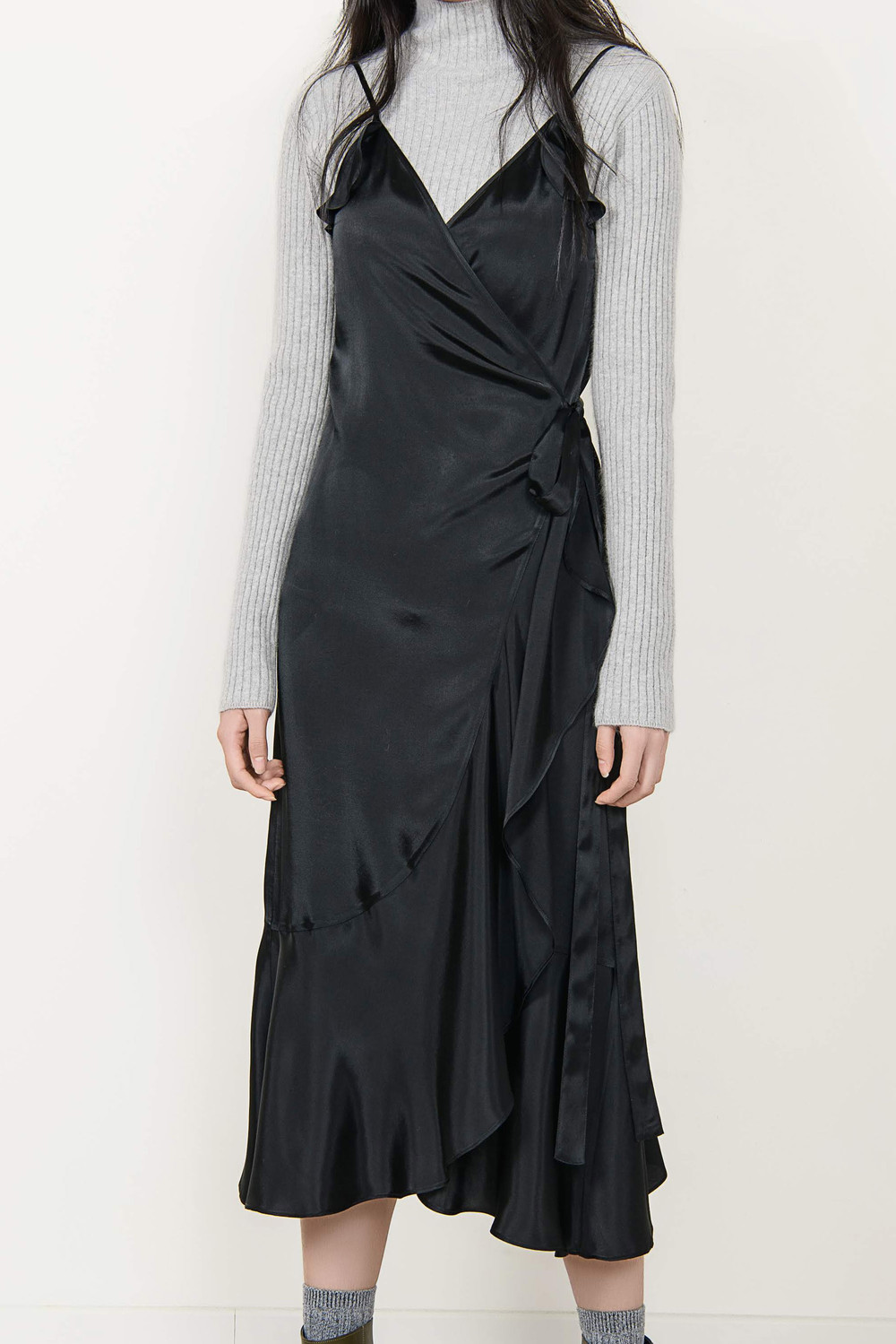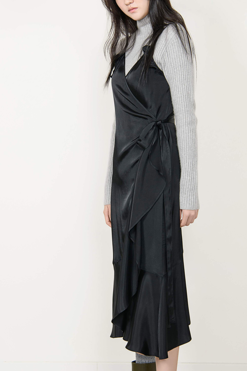 [wasda] satin ruffle wrap one piece black