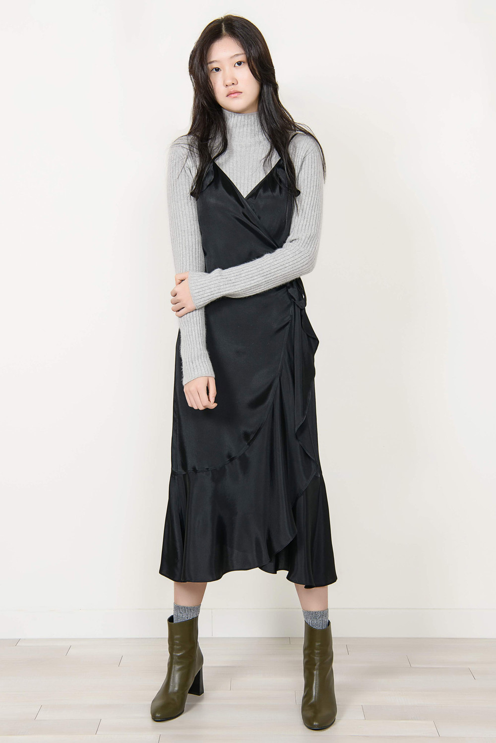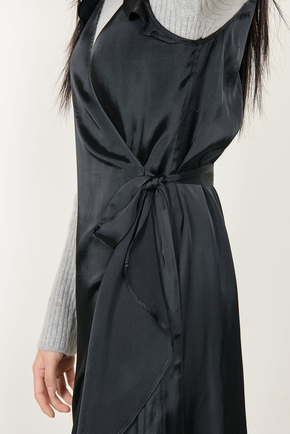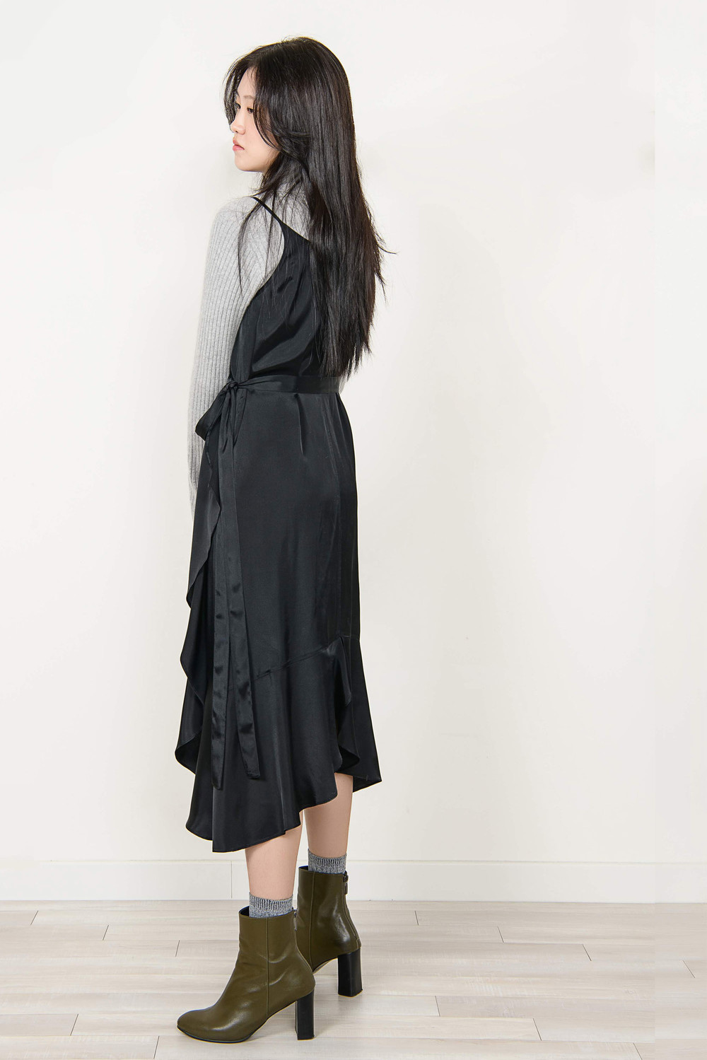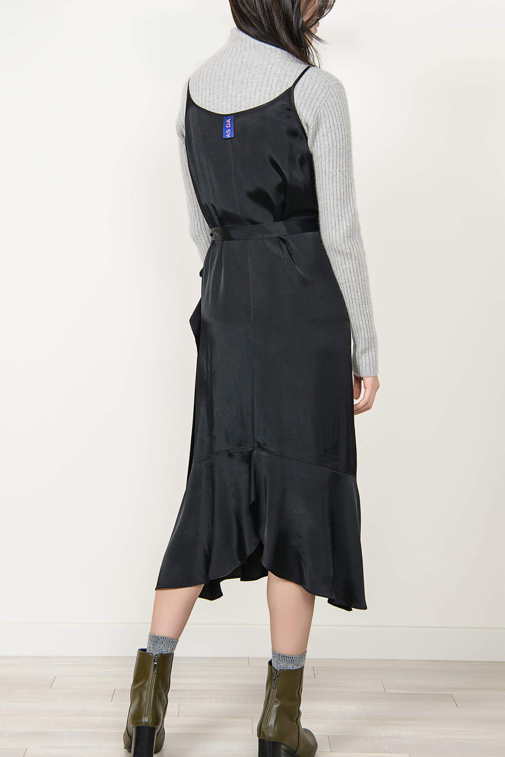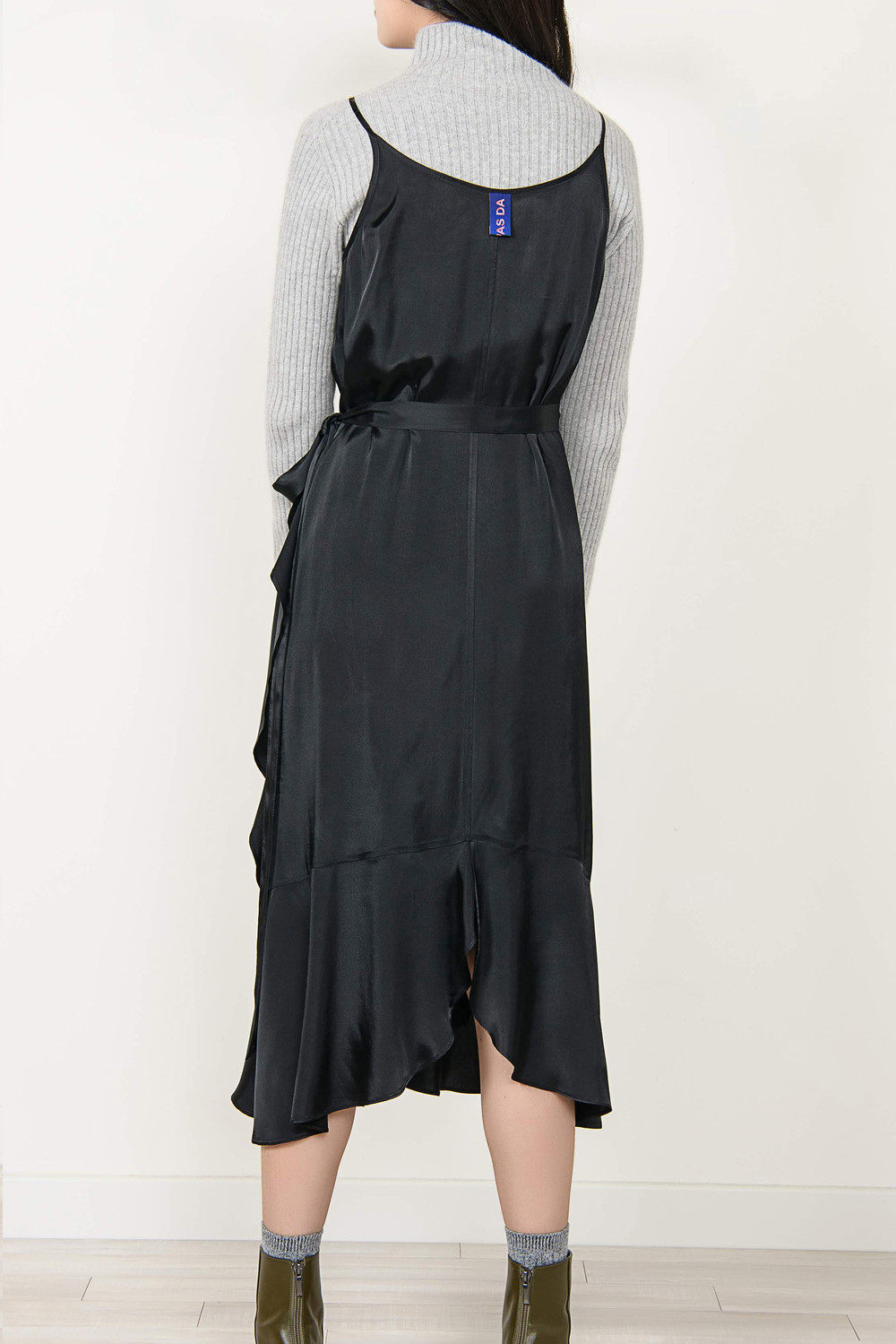 [wasda] satin ruffle wrap one piece black