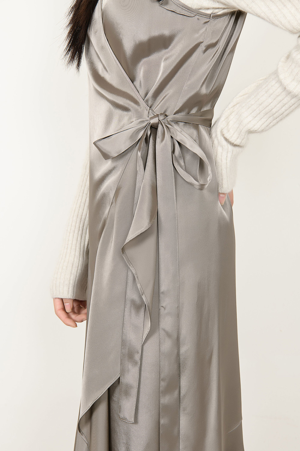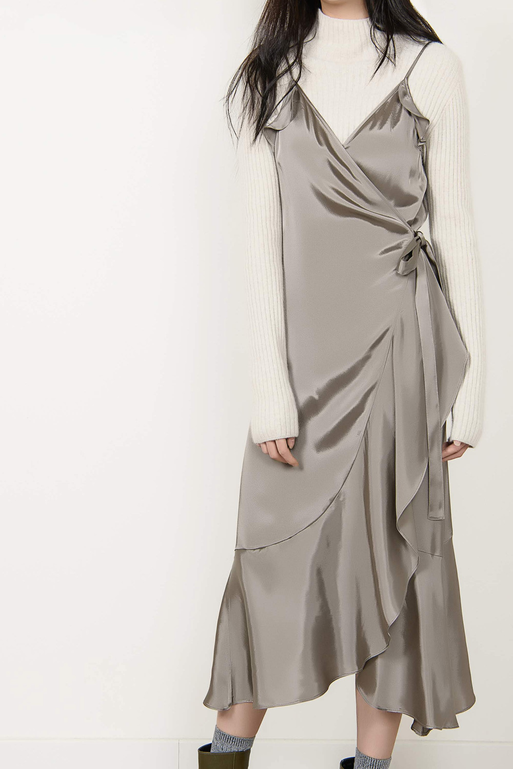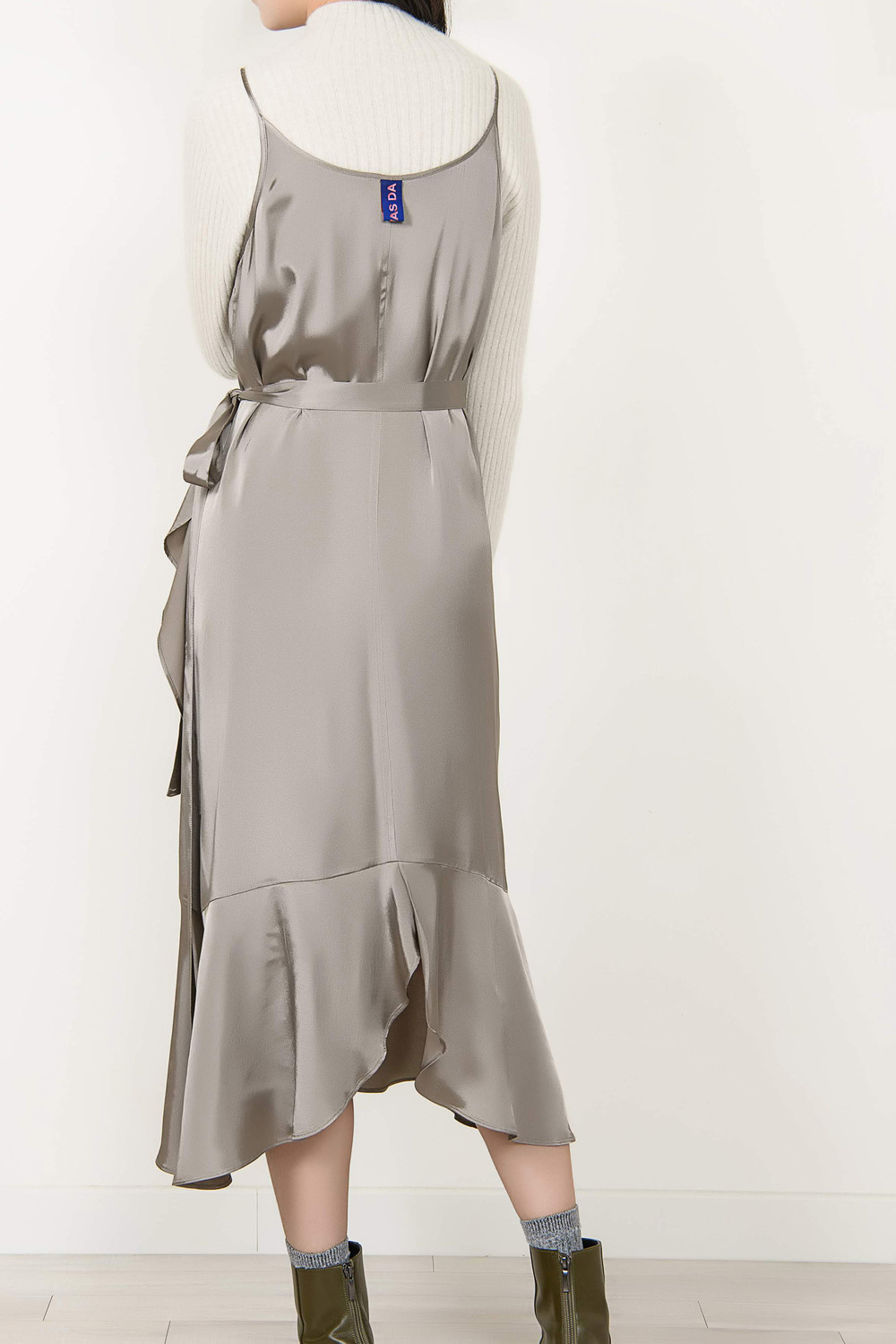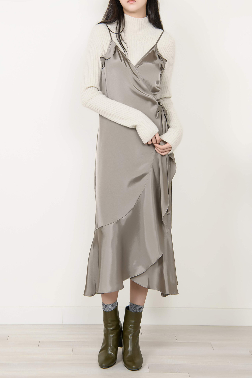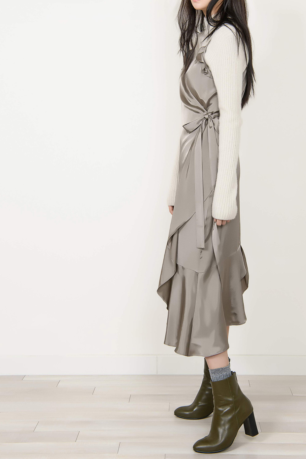 [wasda] satin ruffle wrap one piece beige